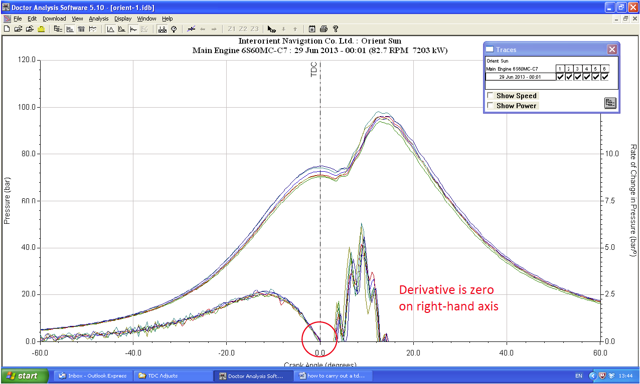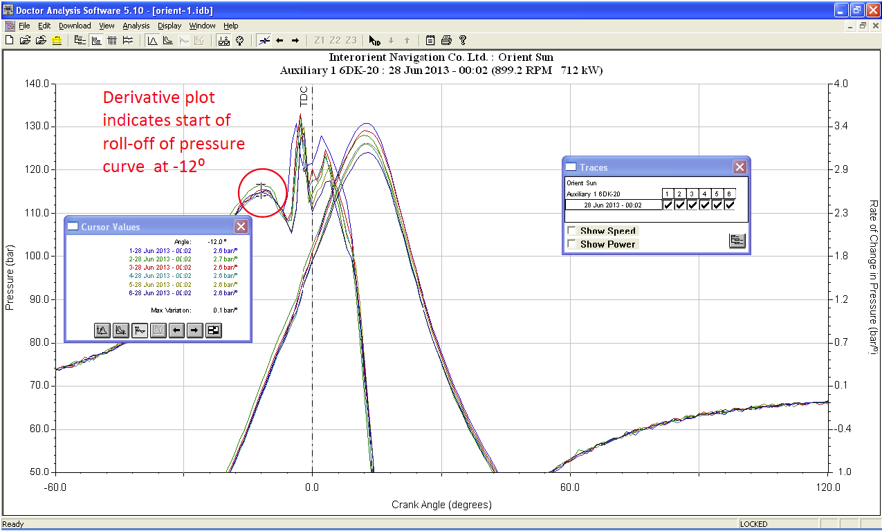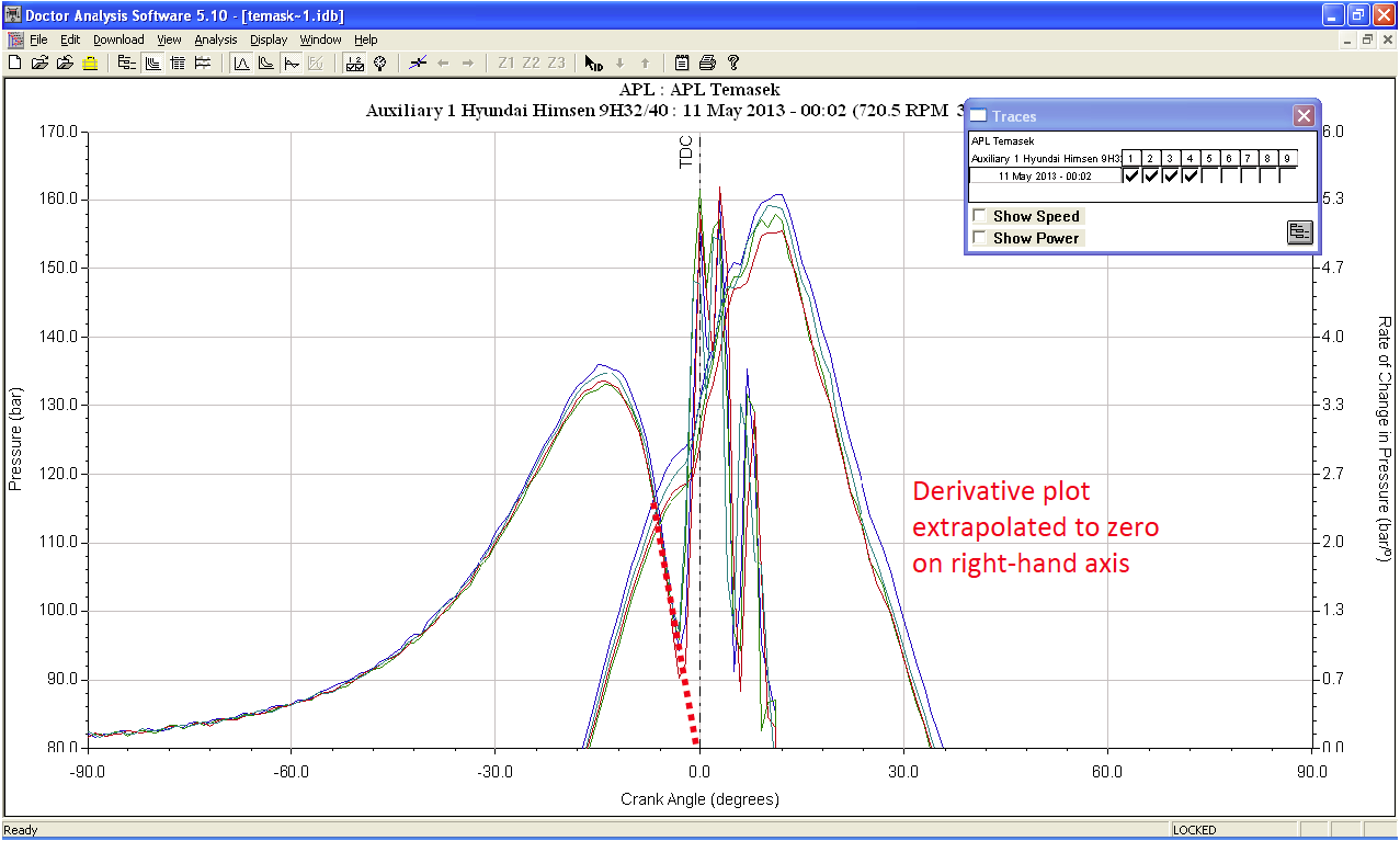 Sometimes engines fire very early and even extrapolation of the derivative curve cannot give a precise adjustment. In this case a good rule is to place the flat part of the derivative curve at ‐12 ⁰. The flat part of the curve indicates where the rise in pressure is starting to roll off towards Pcomp, and this is typically at 12 ⁰ before TDC for four‐stroke medium speed engines. The trace below shows this.
